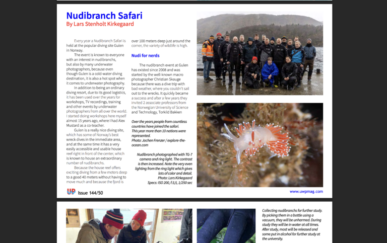 “Nudibranch Safari: Where Photography and Diving Meet”By: Lars Stenholt Kirkegaard Every year a Nudibranch Safari is held at the popular diving site Gulen in Norway. The event is known to everyone with an interest in nudibranchs, but also by many…